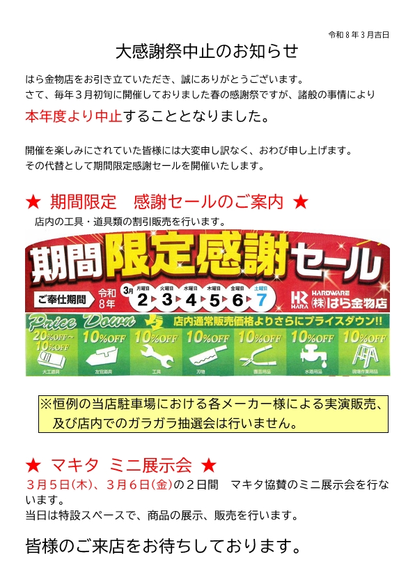 大感謝祭中止と感謝セールのお知らせ
